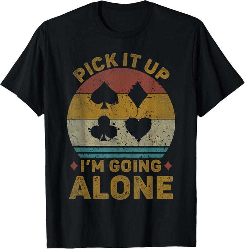 100% Cotton Pick It Up I'm Going Alone Vintage Euchre Card Game T-Shirt