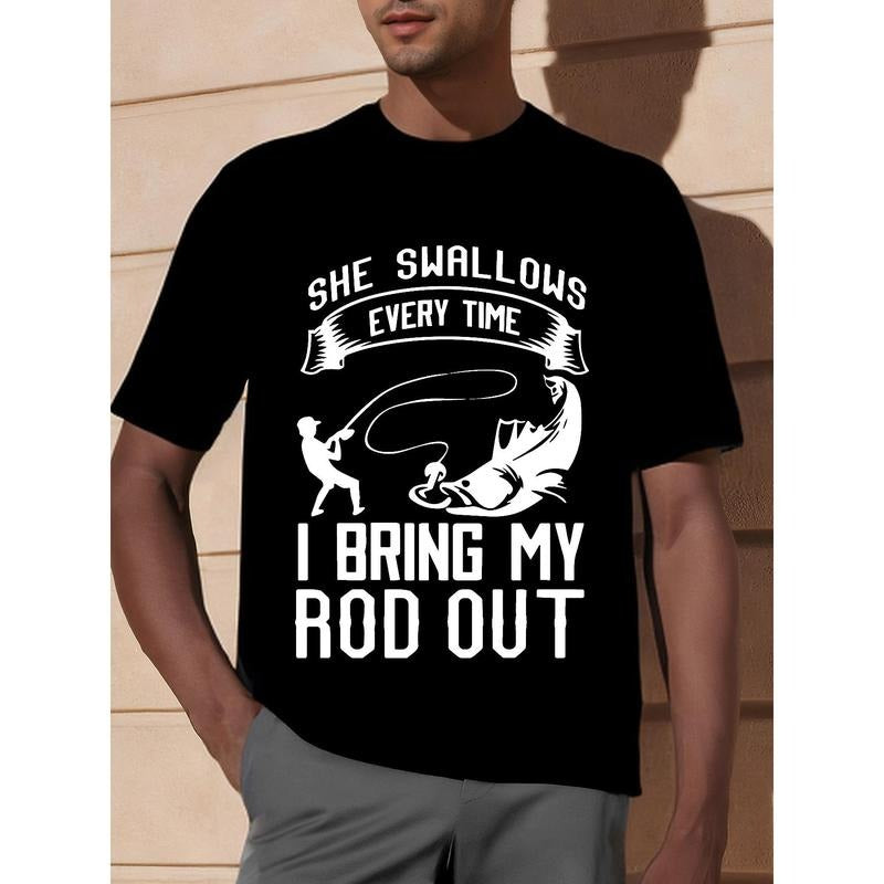 1pc Men'S Casual Cotton T-Shirt with Slight Stretch, Crew Neck, Geometric-Patterned Applique, Sports & Outdoor Themed, Regular Fit, Four Seasons Top for Fishing Enthusiasts Made in USA