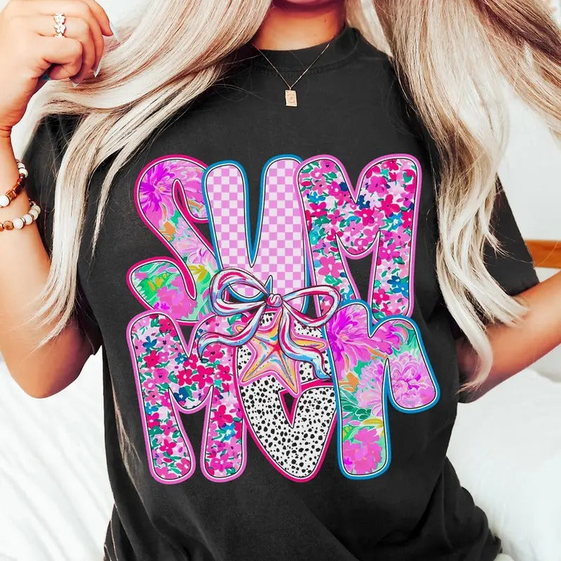 Brushstroke Summer Floral Coquette Bow Tee, Retro Hello Summer Shirt, Summer Vibes Brushstroke Hand Drawn Tee, Gift for Her