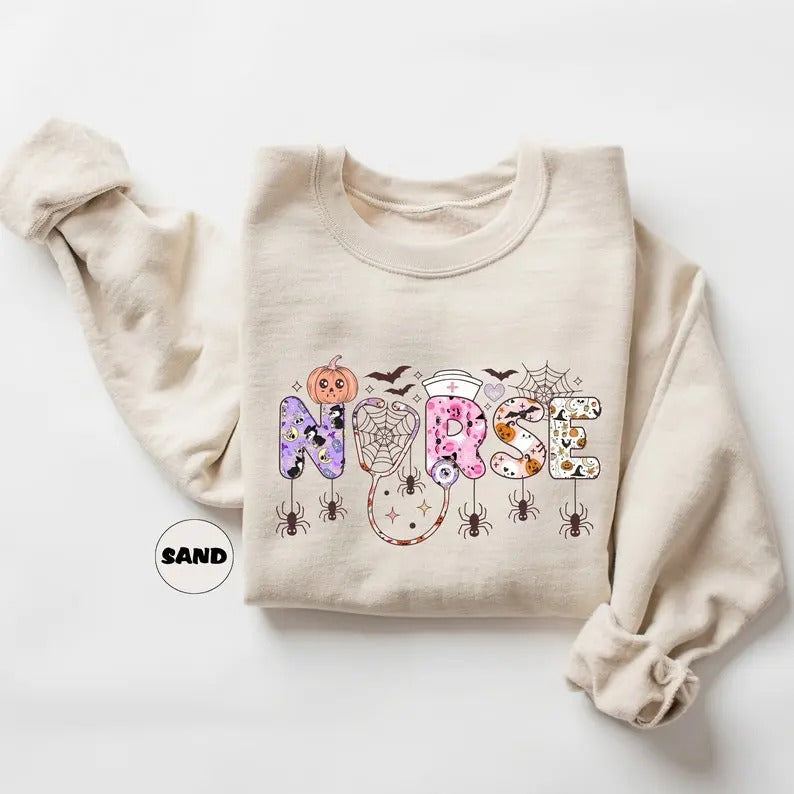 Ghost Nurse Halloween Sweatshirt, Spooky Top Halloween Hoodie, Retro Nurse Tee, Gift for Nurse Menswear Fabric