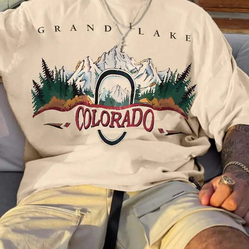 Men's Colorado Landscape Print Drop Shoulder Tee, Regular Fit Casual Street Letter Graphic Round Neck T-shirt Men's Top For Daily Wear 90S Clothes