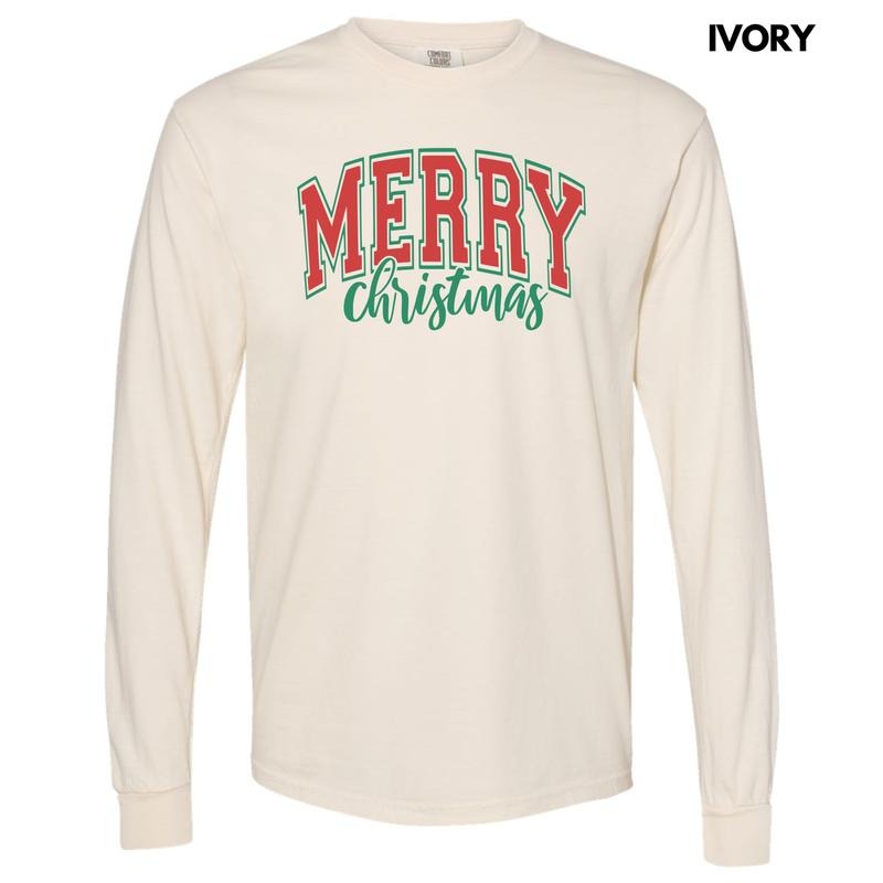 Red Cursive Varsity Merry Christmas Long Sleeve Comfort Colors T-Shirt 'NLB'