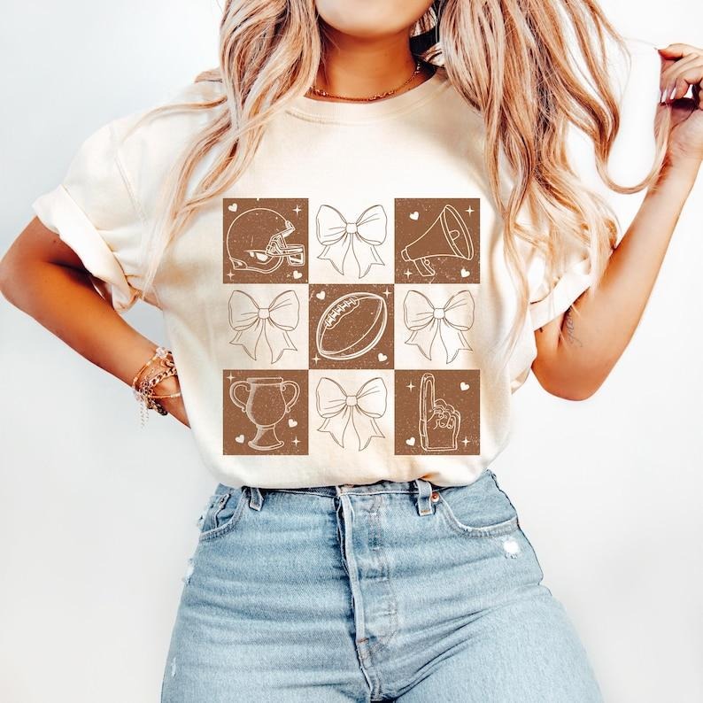 Retro Checkered Football Coquette, Game Day Football, Football Mom, Mama Bow Tshirt