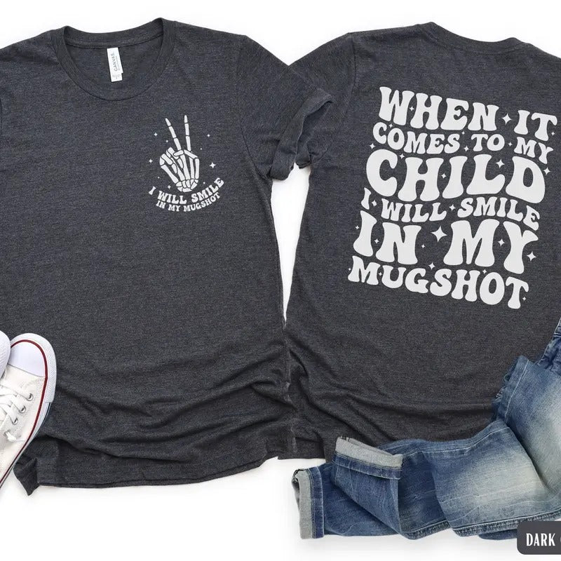 When It Comes To My Child I Will Smile In My Mugshot Shirt Funny Sarcastic Mom Tshirt Retro Mama T-shirt Spooky Mother's Day Gift For Mom