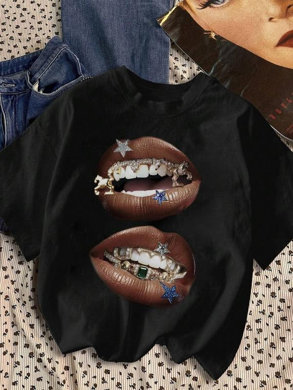 Women's Star & Lip Print Round Neck Tee, Fashion Casual Crew Neck T-Shirt for Daily Holiday Vacation Outdoor Wear, Ladies Clothes for Summer, Top